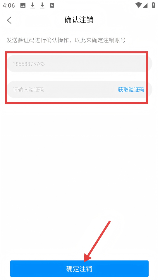 4、在【确认注销】页面,输入手机号验证码后点击【确定注销】按钮,可完成账号注销操作。