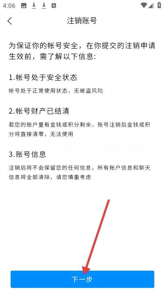 3、在【注销账号】页面,了解账号安全、财产结清、信息清除等信息后点击【下一步】,可继续注销流程。