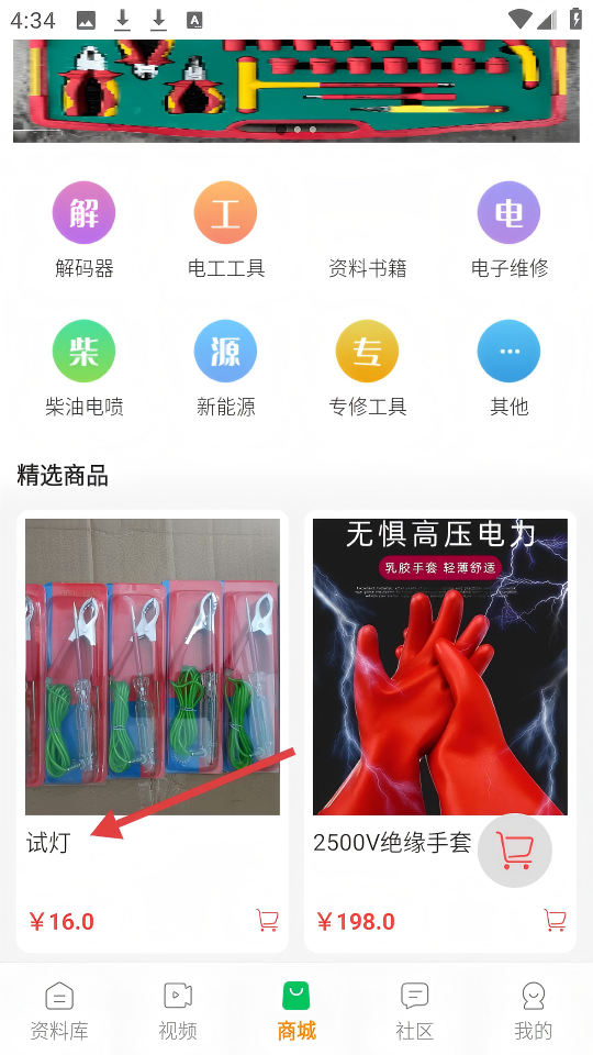 2、在该应用【商城】页面,点击【试灯】精选商品,进行购买下单。