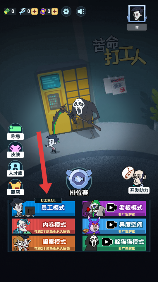 1、在模式选择界面点击【员工模式】,进入游戏场景开启摸鱼挑战。