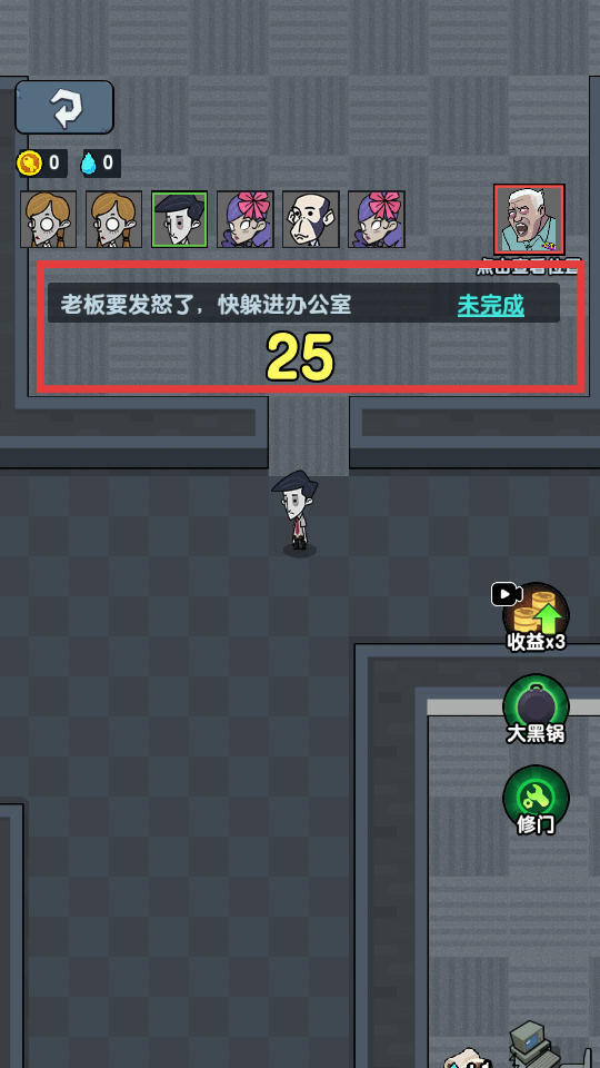2、注意“老板要发怒了,快躲进办公室”的提示,在倒计时结束前控制角色移动到办公室,躲避老板的怒火。