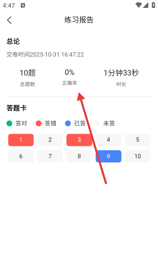 4、作答完成后,可查看练习报告,了解总题数、正确率、时长及答题卡答题情况。