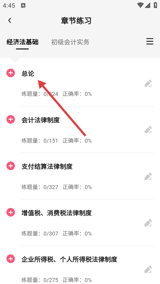 2、在章节选择页面,选择目标章节(如“总论”),进入章节练习答题页面。