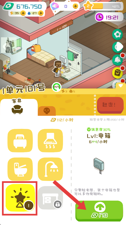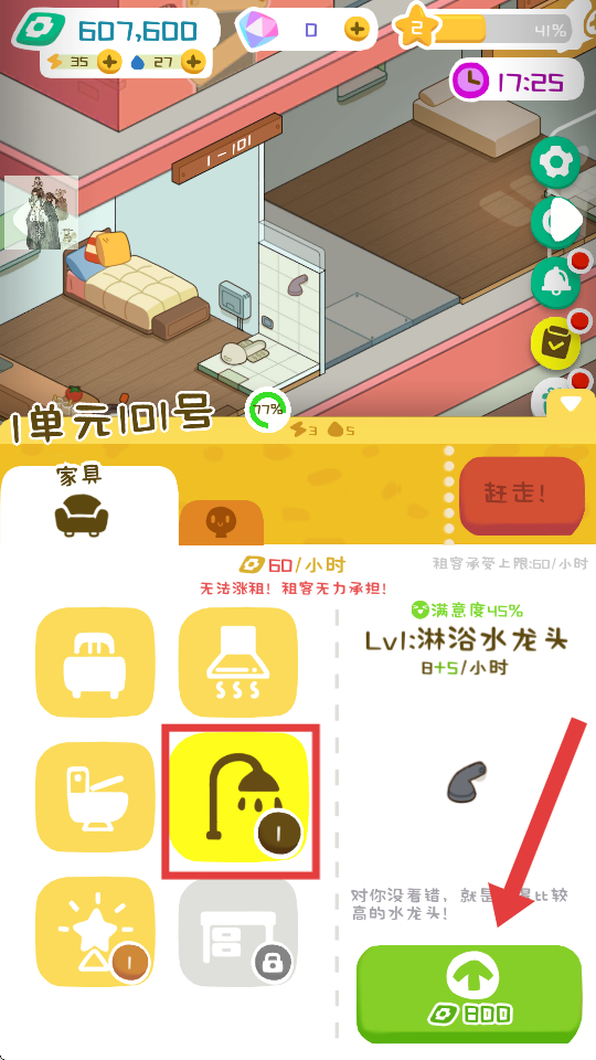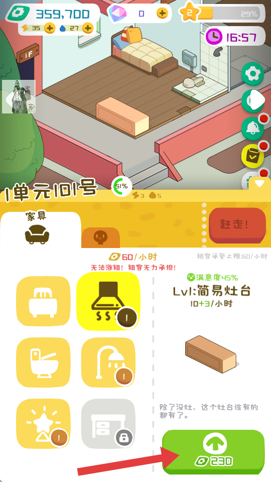 2、在家具列表中选择可升级的家具(如简易灶台),点击绿色升级按钮,消耗资源提升家具等级,增加租金收益和租客满意度。