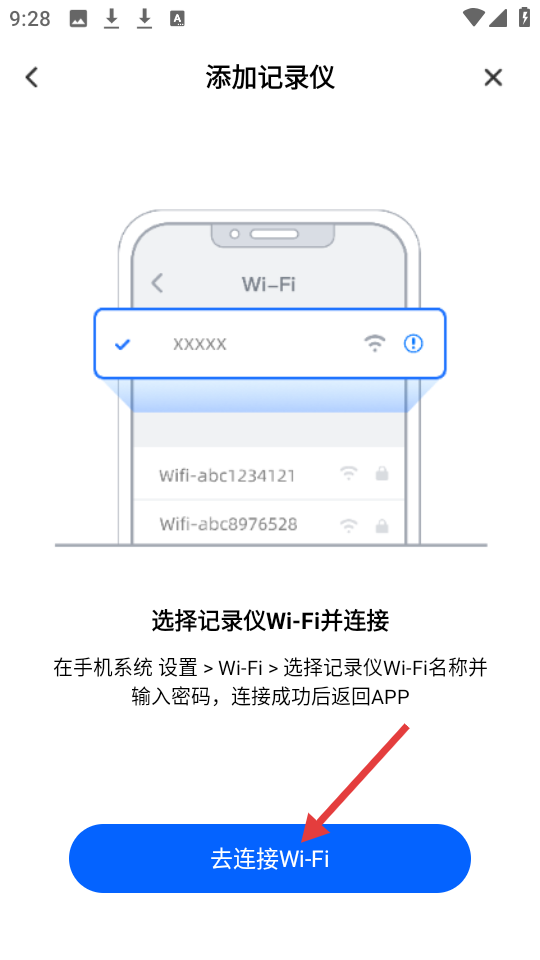 4、点击【去连接Wi-Fi】,按提示在手机系统设置的Wi-Fi中选择记录仪Wi-Fi名称并输入密码。
