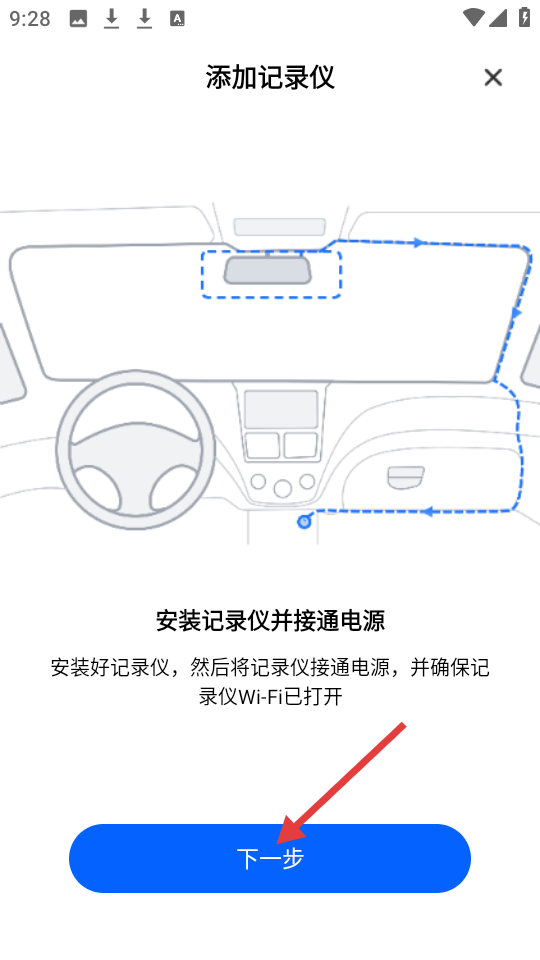 3、安装好记录仪并接通电源,确保记录仪Wi-Fi已打开,点击【下一步】。