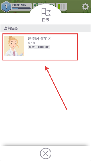 1、当前任务需建造8个住宅区,需继续规划建造住宅区,完成进度以获取【1000】-【XP】奖励,助力城市升级。