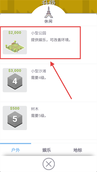 2、升级界面可建【小型公园】,花费【2000】元,能提供娱乐、改善环境,吸引市民,优化城市生态与居住体验。