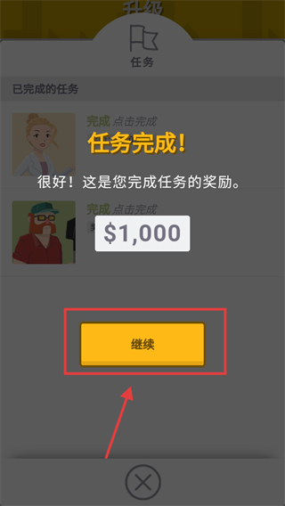 4、任务完成后领取【1000】元奖励,点击【继续】按钮,回到游戏界面继续推进城市建设与任务进程。
