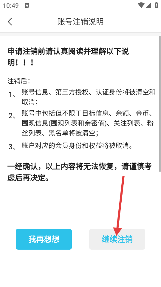 4、在账号注销说明页面中,阅读注销说明后,点击【继续注销】按钮可继续完成账号注销操作。