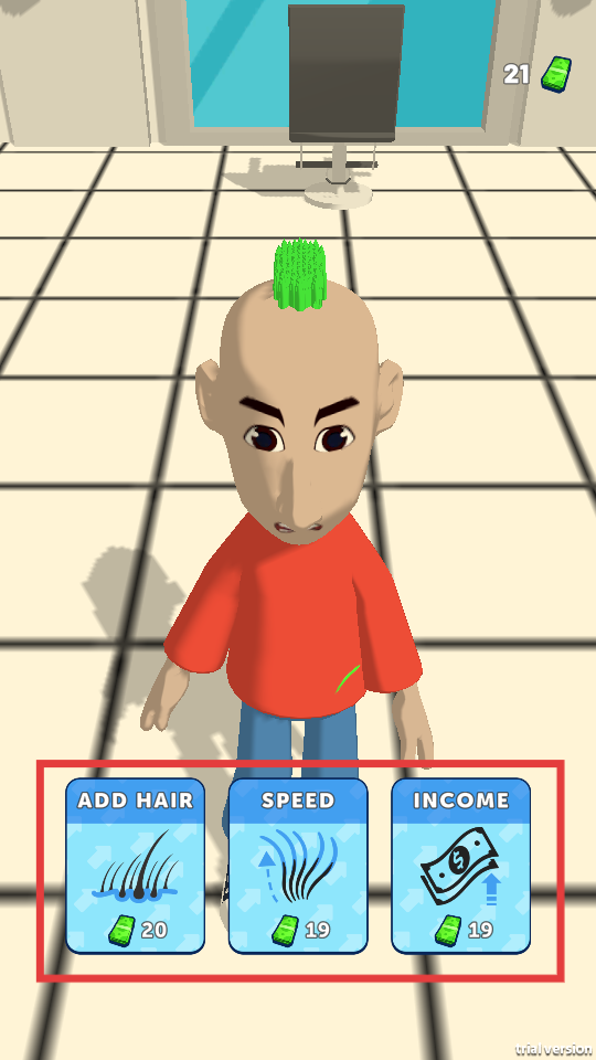3、消耗资源升级“ADD-HAIR(增加头发)”“SPEED(生长速度)”“INCOME(收益)”等功能,提升头发生长效率和资源获取速度。