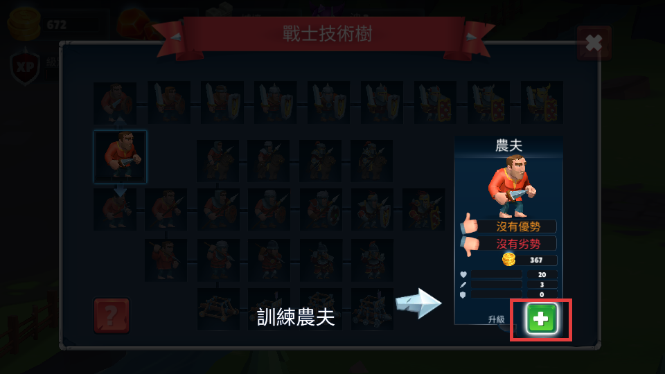 1、训练农夫,提升士兵战力,为抵御敌人进攻做好准备。