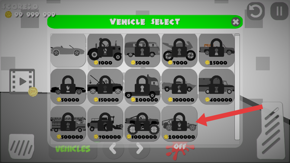1、点击【VEHICLES】按钮,进入车辆选择界面,利用无限金币可解锁各类车辆。