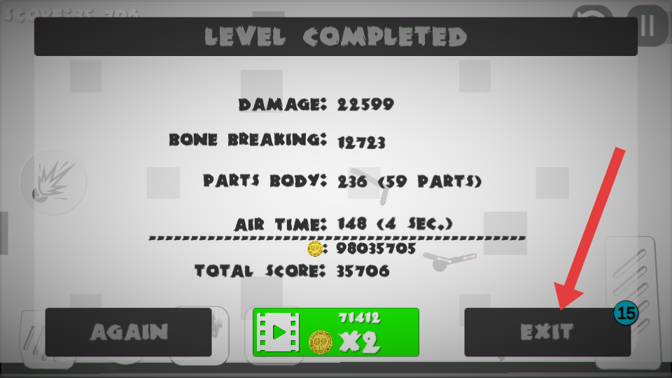 4、关卡完成后,可点击【EXIT】退出,也可利用无限金币继续挑战,不断刷新分数记录。