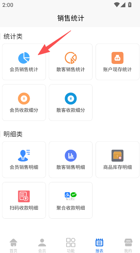 1、打开软件,进入报表,选择会员销售统计。