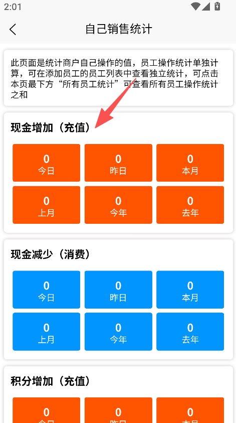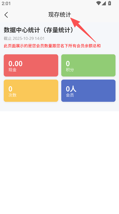 3、进入现存统计,查看现金、积分、会员数量等数据。