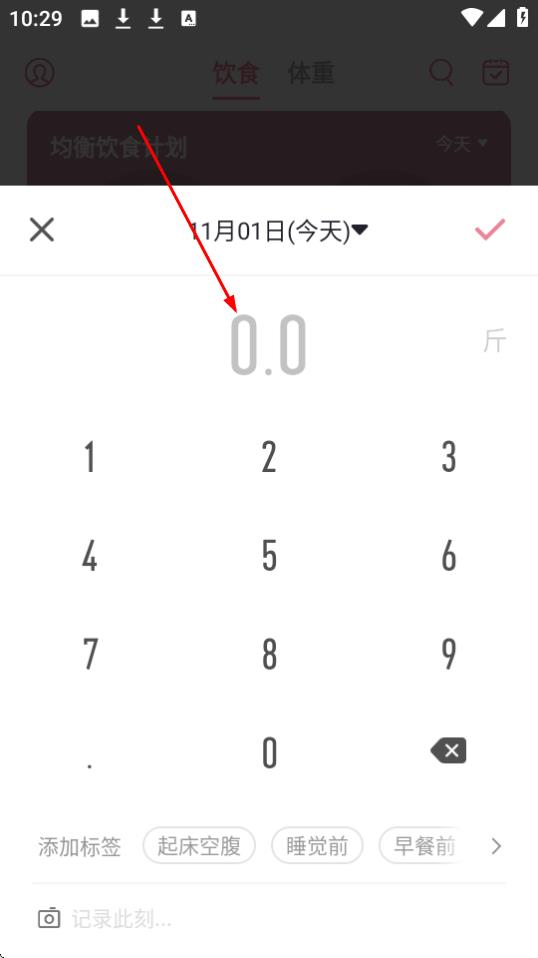 3、选择日期,输入体重数值,添加【起床空腹】等标签,点击对勾完成体重记录。