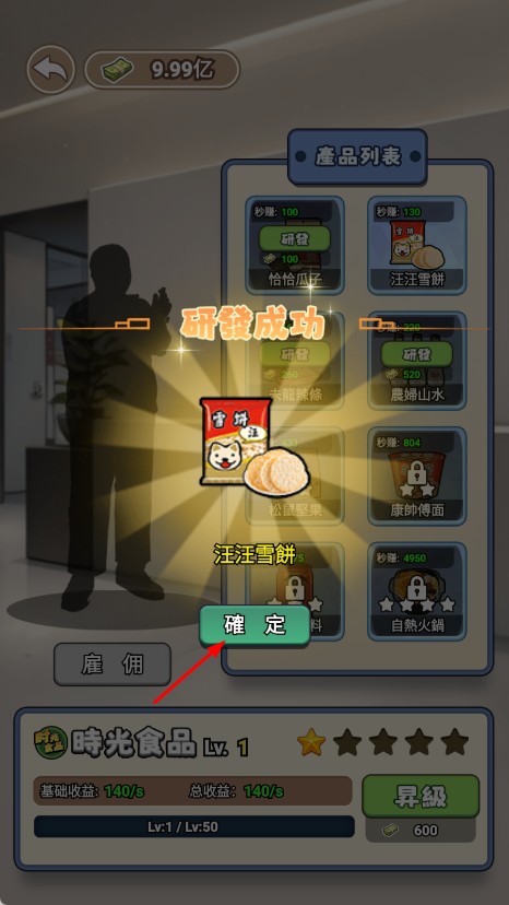 4、研发成功点击【確定】,获得【汪汪雪餅】,确认后用新品提升收益。