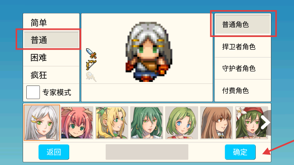 2、角色选择时,选【普通】难度与【普通角色】,点【确定】,进入属性选择环节。