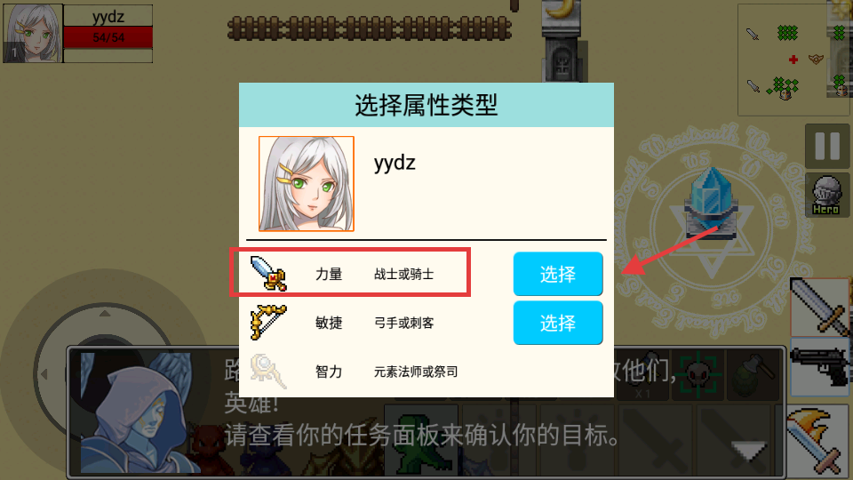 3、属性选择选【力量】(对应【战士-或-骑士】),点【选择】,开启近战职业养成。