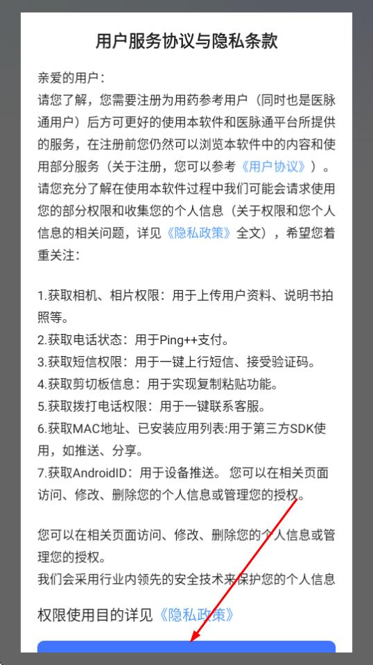 1、阅读【用户服务协议与隐私条款】后点击下方确认按钮。