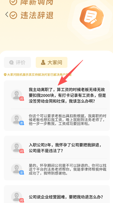 3、问答覆盖全面,包含违工资扣除等多种劳动纠纷问题及解答,劳动纠纷咨询场景广泛,用户各类疑问可解决。