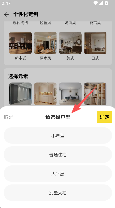 2、支持元素户型选择功能,背景墙、玄关柜等元素,小户型、别墅大宅等户型选择,用户定制装修细节。