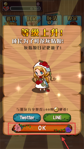 3、等级上升后点击【OK】确认,可继续养成,或分享得【100】枚【硬币】。