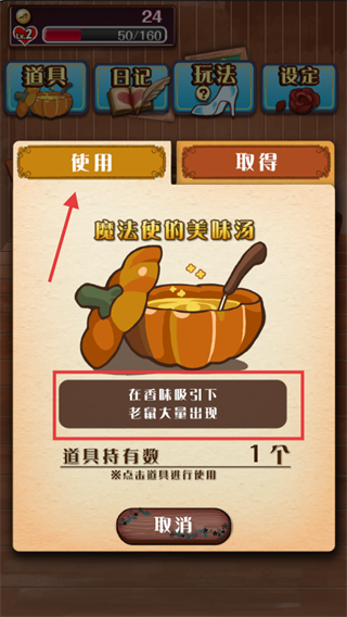 4、使用【魔法使的美味汤】,借香味吸引【老鼠】大量出现,快速获硬币加速养成。