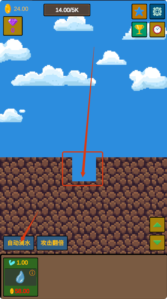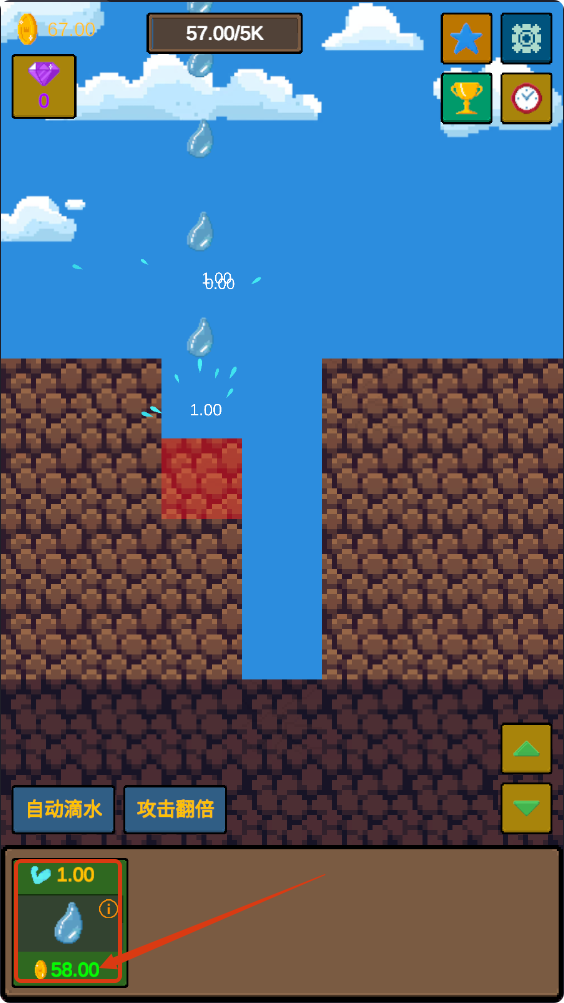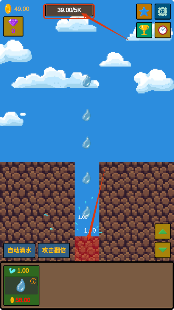 2、挖掘过程中关注上方进度【39.00/5K】,让水滴持续下落,不断拓展挖掘深度,积累资源。