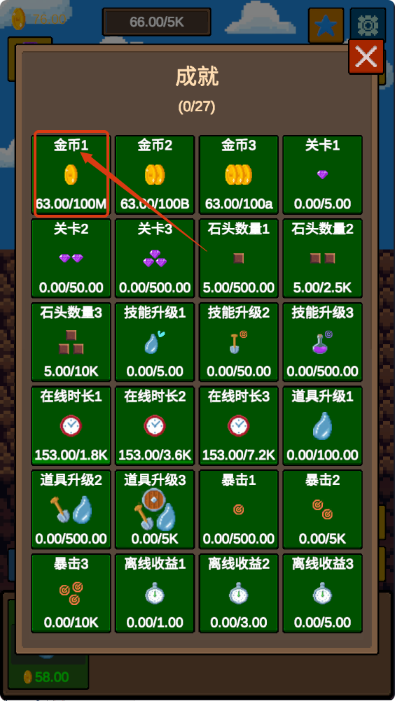 4、完成挖掘任务后查看成就界面,优先解锁【金币1-63.00/100M】成就,积累成就点数提升游戏进度。