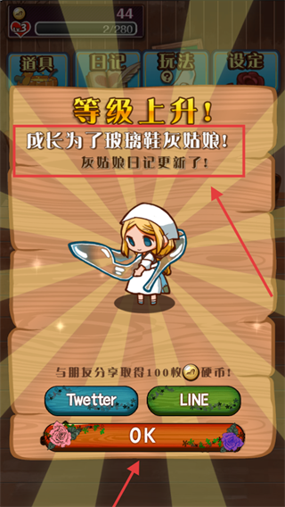 2、等级上升解锁【玻璃鞋灰姑娘】,点击【OK】继续,分享可获100枚【硬币】。