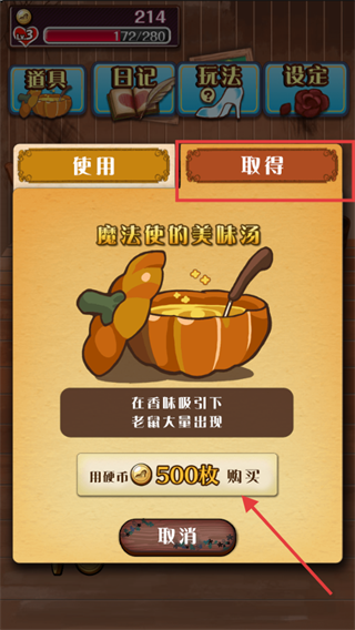 3、攒500枚【硬币】购买【魔法使的美味汤】,吸引大量【老鼠】,快速集满心槽。