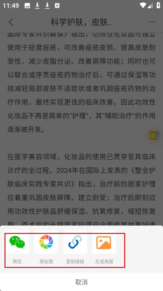4、可点击【微信】【朋友圈】【复制链接】【生成海报】等选项分享护肤相关内容。