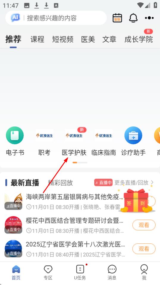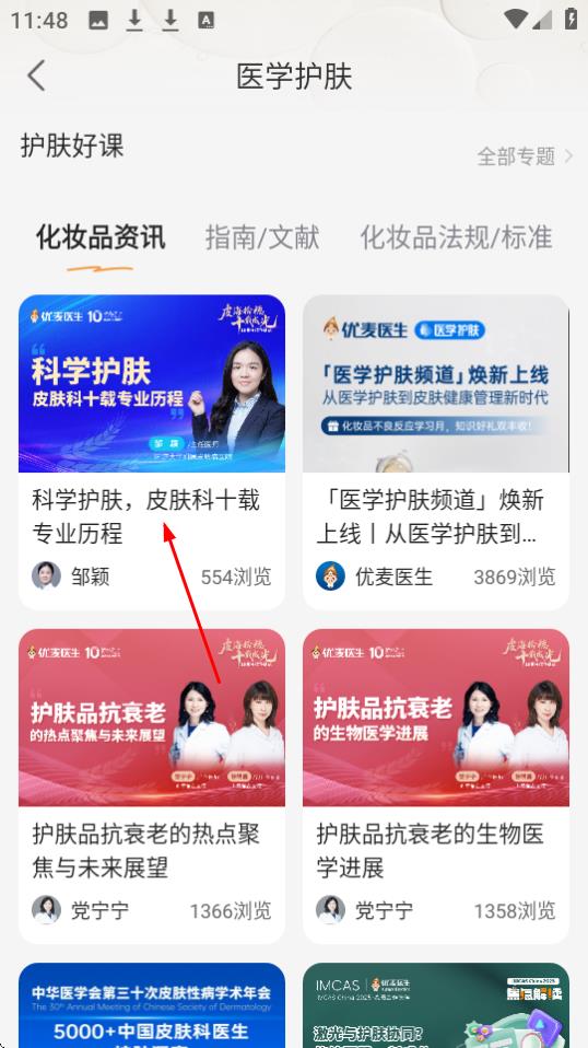 1、在应用首页点击【医学护肤】入口,可进入相关板块查看护肤资讯、课程等内容。