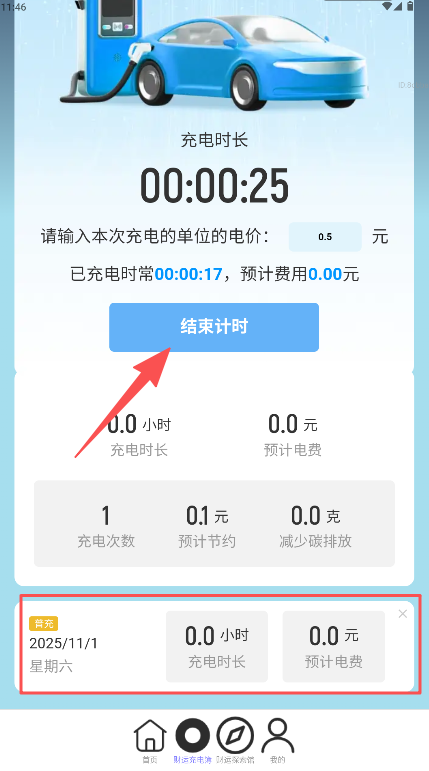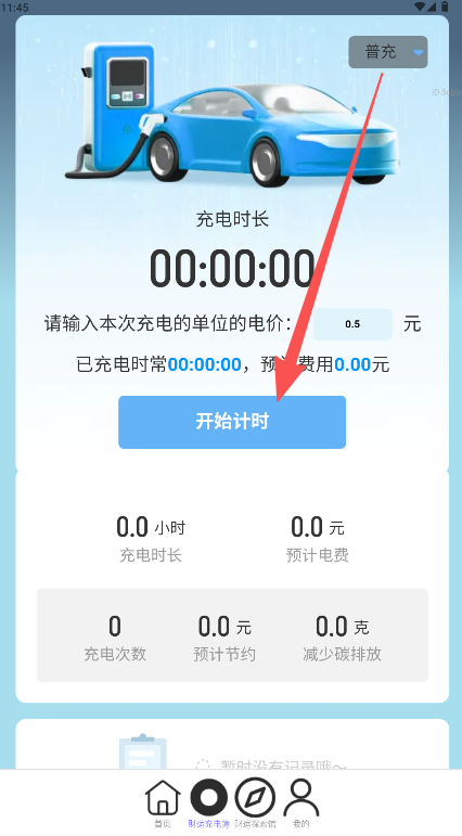 2、在充电页面点击“开始计时”按钮,系统开始记录充电时长并计算预估费用。