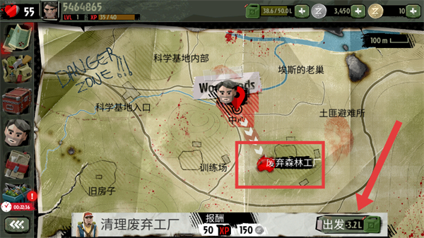 2、在地图界面选择任务区域(废弃森林工厂),点击【出发】,消耗燃油前往任务地点。