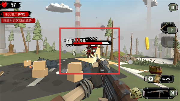 4、战斗中使用枪械攻击僵尸,注意僵尸的血量条,持续射击直至消灭僵尸(如灭斧男僵尸),完成“杀死僵尸”的任务要求。