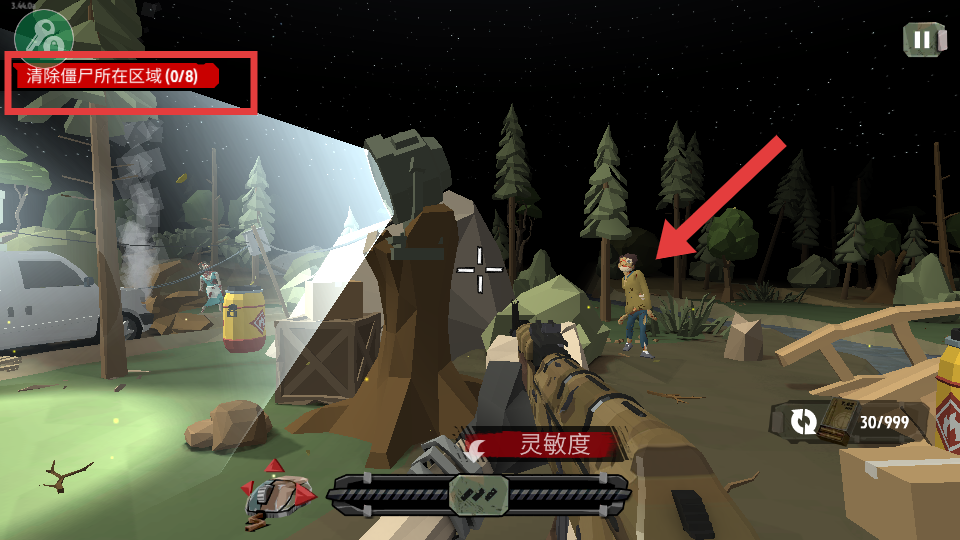 1、根据【清除僵尸所在区域-0/8】任务提示,使用枪械攻击场景中的僵尸,逐步清理完8个区域的僵尸。