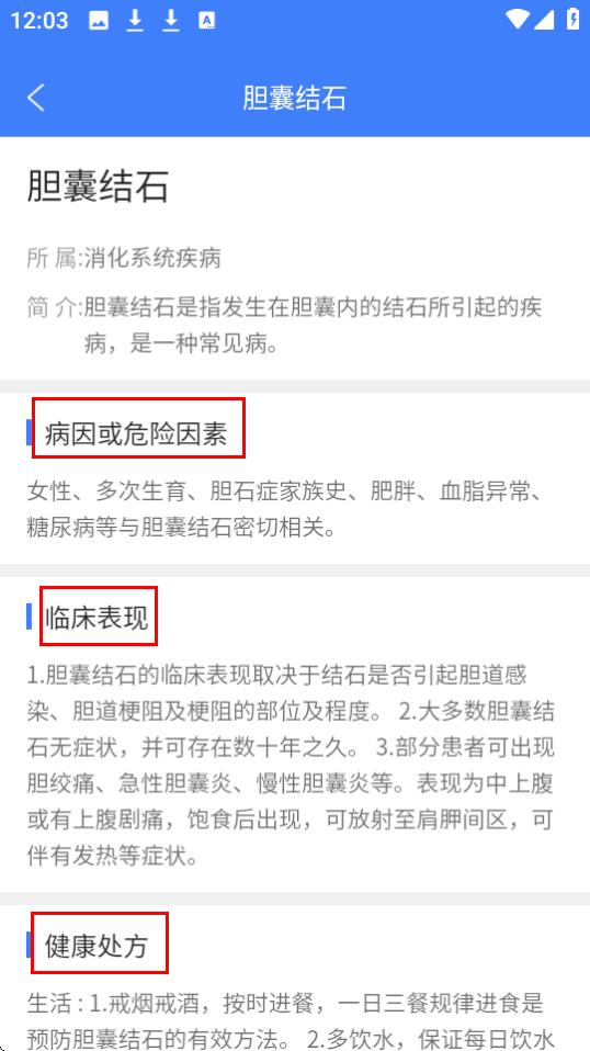 4、查看胆囊结石信息,可了解其【病因或危险因素】【临床表现】【健康处方】等内容。