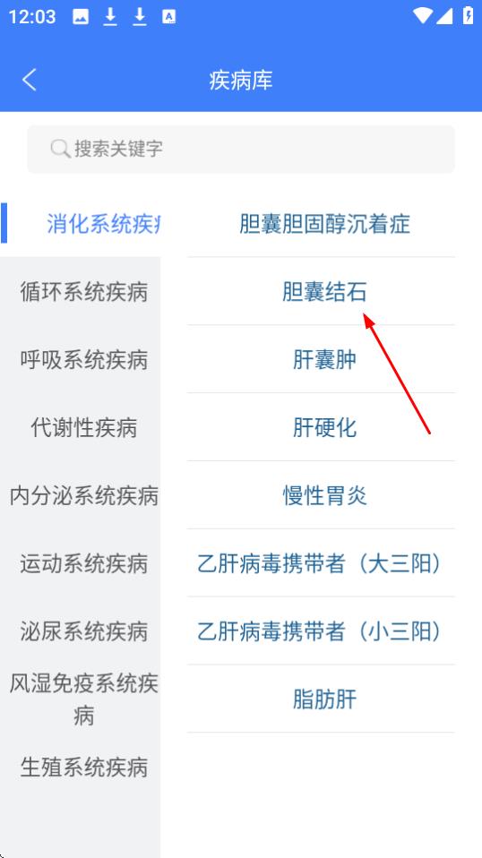 3、在【疾病库】中,可找到【消化系统疾病】分类下的【胆囊结石】条目查看详情。
