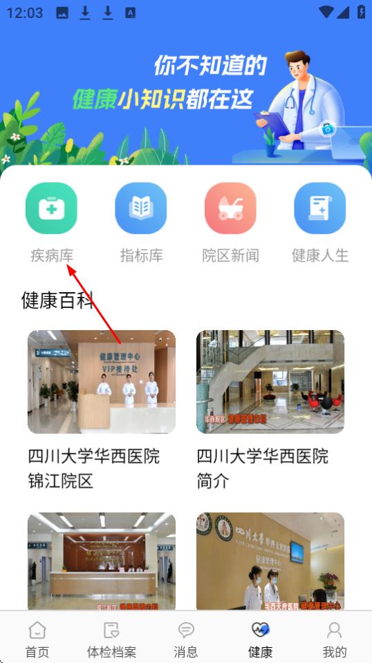 2、进入【健康】板块的【健康百科】,点击【疾病库】可进入疾病查询页面。