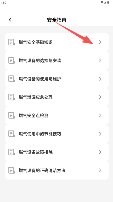 2、在列表中选择“燃气安全基础知识”选项,查看详细内容。