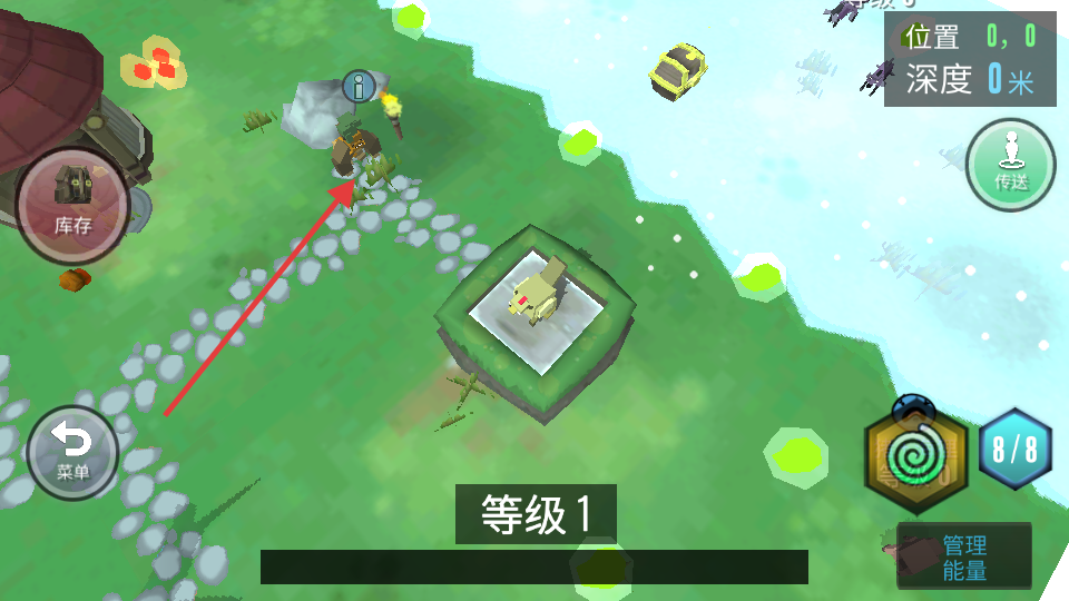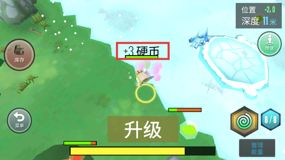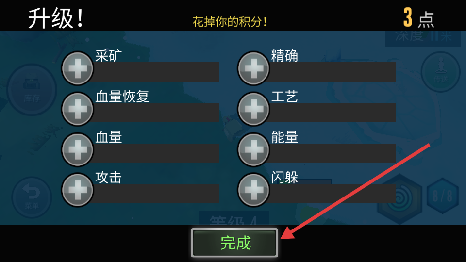 4、升级时可分配点数到采矿、血量、攻击等属性上,提升角色能力,点击【完成】确认加点,继续游戏冒险。