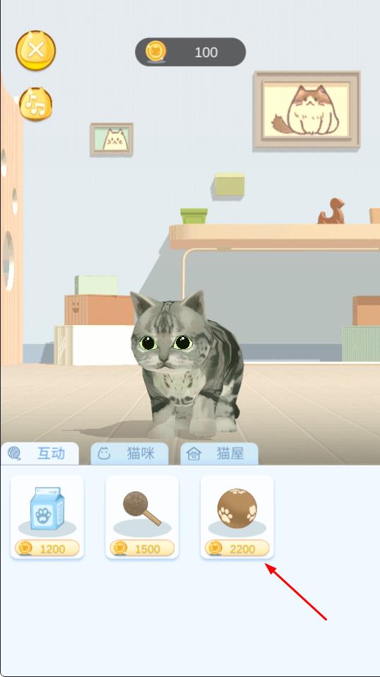 4、在【互动】板块,可花费金币购买如标价2200金币的玩具与猫咪互动。