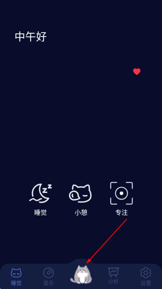2、点击底部中间的猫咪图标,可进入包含【睡觉】【小憩】【专注】功能的界面。