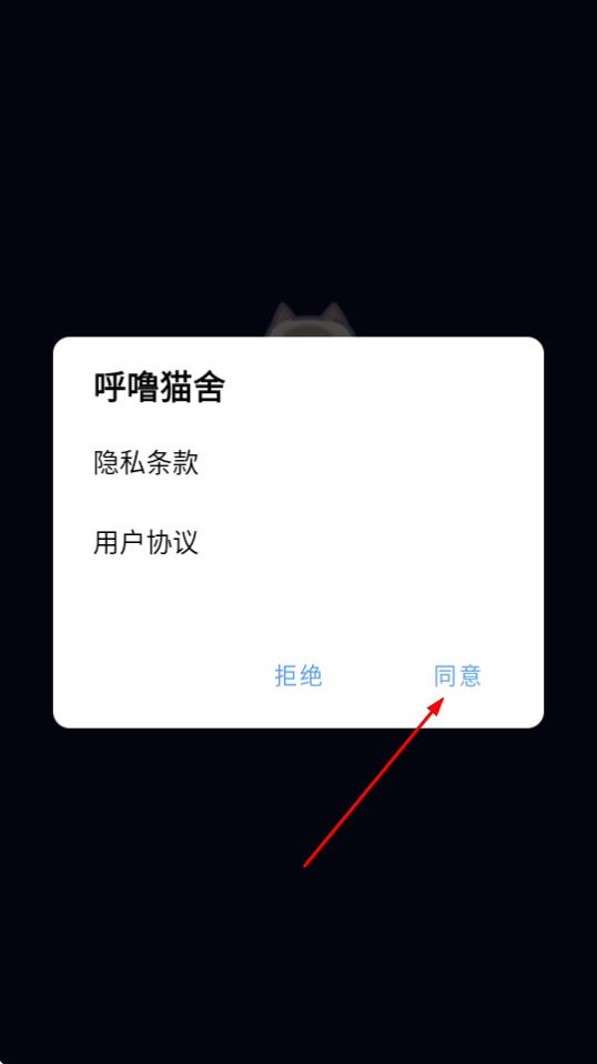 1、点击【同意】按钮,接受【呼噜猫舍】的【隐私条款】和【用户协议】。