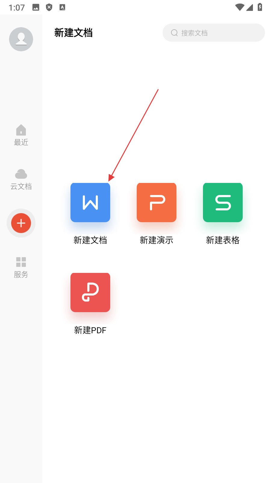 2、在新建文档功能选择界面,点击【新建文档】,进入新建文档模板选择页面。