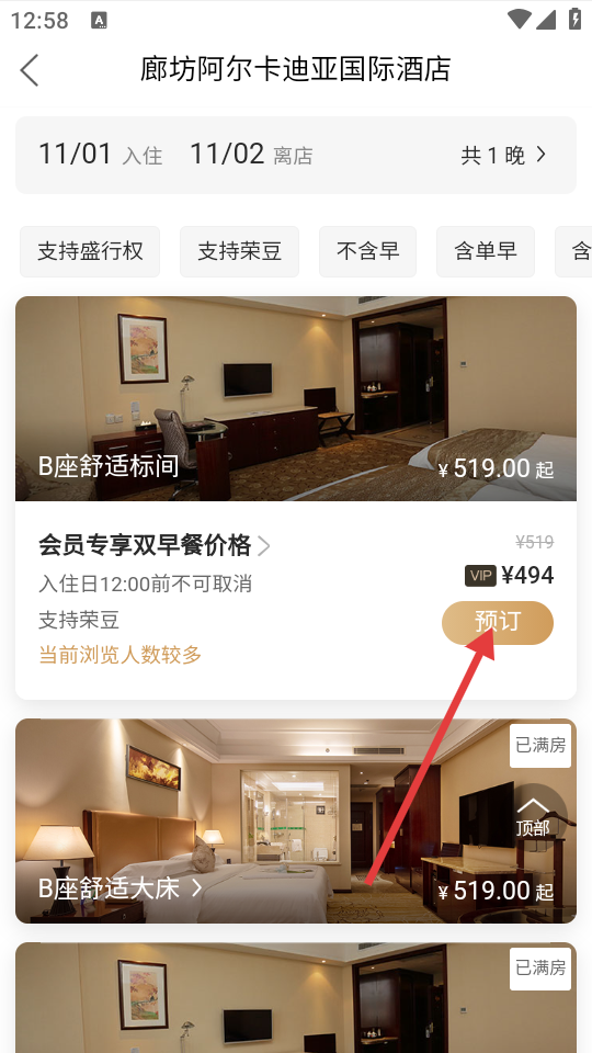 3、在酒店列表页面中,选择目标酒店房型,如【B座舒适标间】,点击【预订】按钮以进入房间详情及订单填写页面。