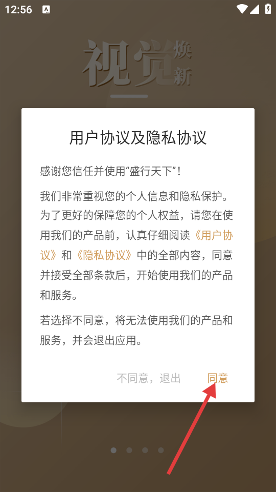 1、在用户协议及隐私协议弹窗中,点击【同意】按钮以继续使用软件。